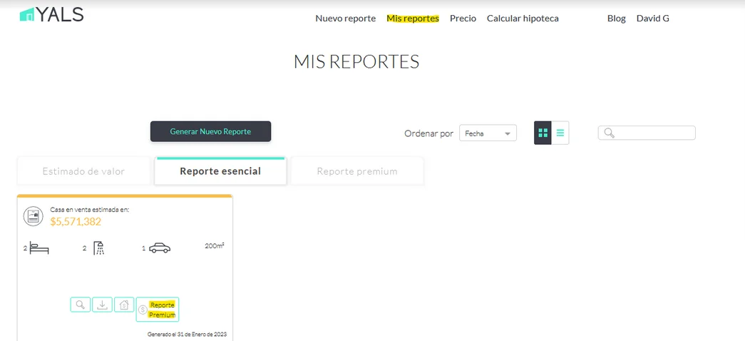 - Navegar al módulo "Mis reportes" para visualizar los reportes que ha generado. Estos están divididos en tres pestañas: "Estimado de valor", "Reporte esencial" y "Reporte premium"