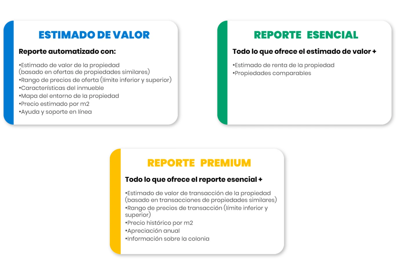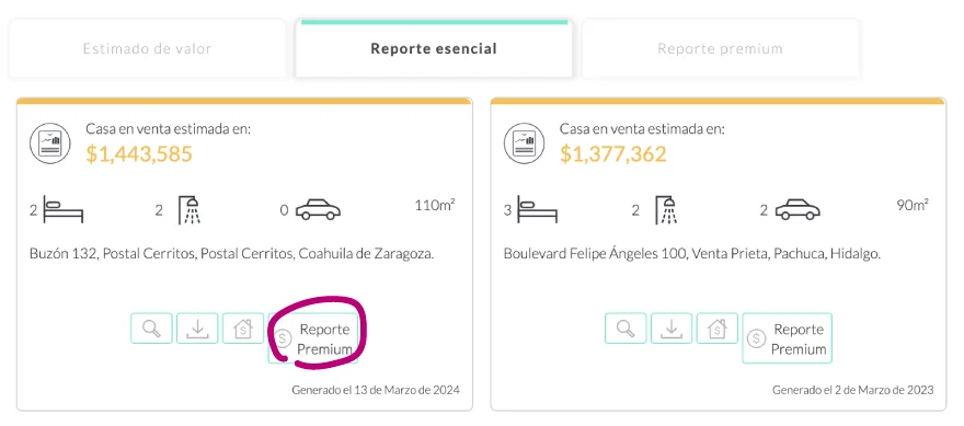 Si adquiriste un estimado de valor ($99 MXN), conviértelo en un reporte esencial ($149 MXN) o reporte premium ($299 MXN) pagando solo la diferencia.