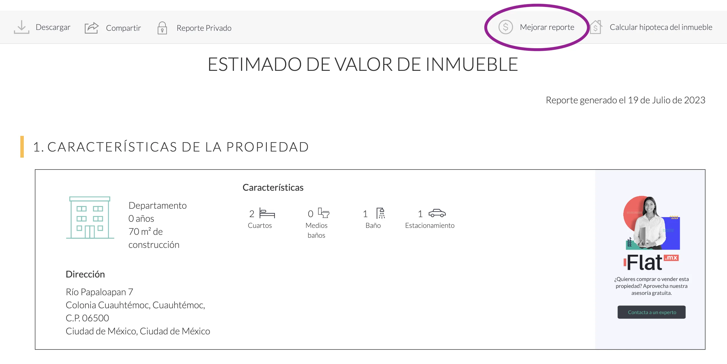2.- Directamente en tu reporte (estimado de valor o reporte esencial), en la parte superior derecha puedes dar clic en "Mejorar reporte" para elegir la mejora que deseas realizar.