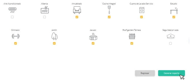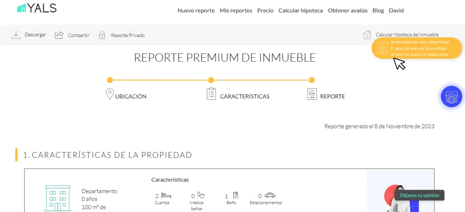 se mostrará el detalle de cuántos créditos disponibles tiene (en caso de no contar con créditos disponibles, el ícono de créditos disponibles no se mostrará). En este caso, el usuario cuenta con 4 créditos para generar estimados de valor, 2 créditos para generar reportes esenciales, y 5 créditos para generar reportes premium.