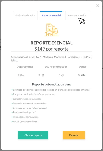la primera oferta que aparecerá será la opción para comprar un "Reporte esencial" de $149 pesos. Y al dar clic en la pestaña "Reporte premium"
