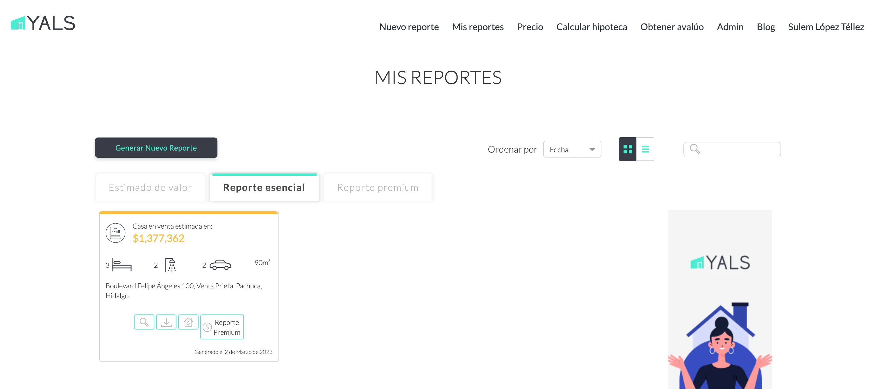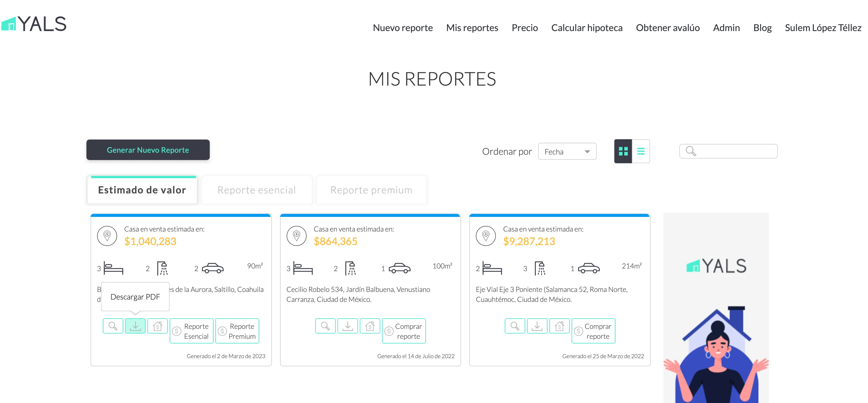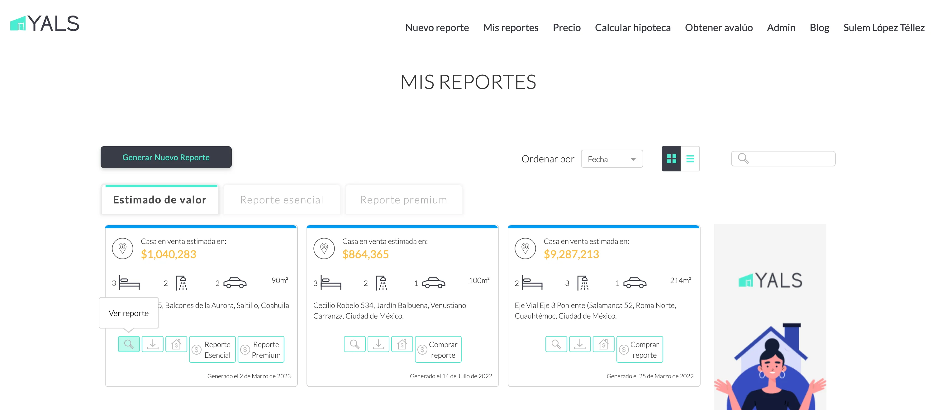 Puedes consultar en cualquier momento los reportes que has generado en YALS, sólo tienes que hacer clic en el menú “Mis reportes” y podrás ver todos los reportes completos y estimados de valor que has generado con las características principales de la propiedad.