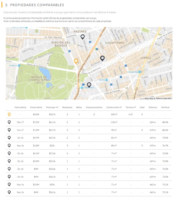 Las propiedades comparables y sus precios se obtienen de listados de precios de venta públicos en internet. Estos listados se analizan, limpian y estructuran para poder decirte qué propiedades son las que más se parecen a la que estás analizando.
